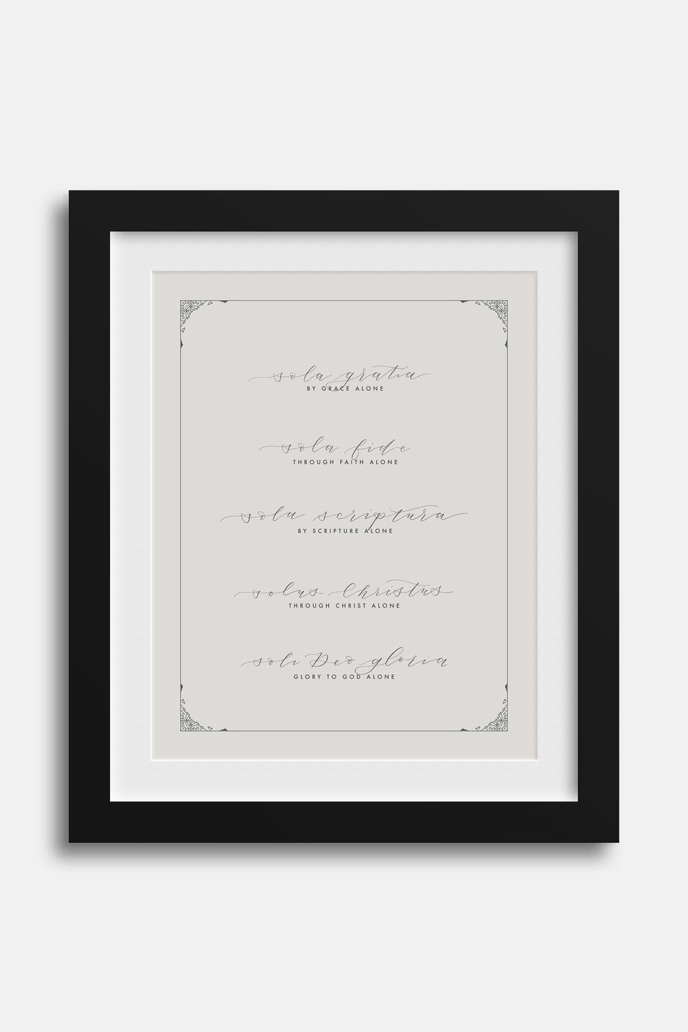 “The Five Solas are five Latin phrases that represent the core positions held by those who adhere to the Protestant Reformation that happened in the 16th century. They are more commonly recognized within the Reformed (Calvinist) perspective. They are Sola Scriptura, Sola Christus, Sola Gratia, Sola Fide, and Sola Deo Gloria.