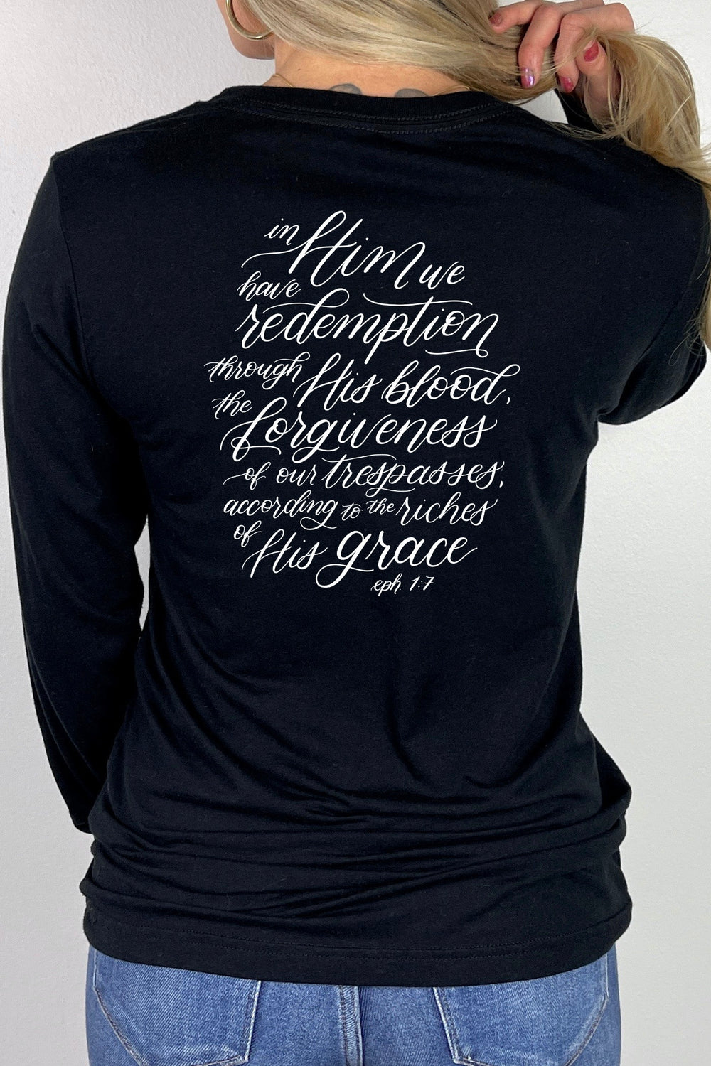 “In him we have redemption through his blood, the forgiveness of our trespasses, according to the riches of his grace…” (hey, that’s what’s on the back of this tee!)